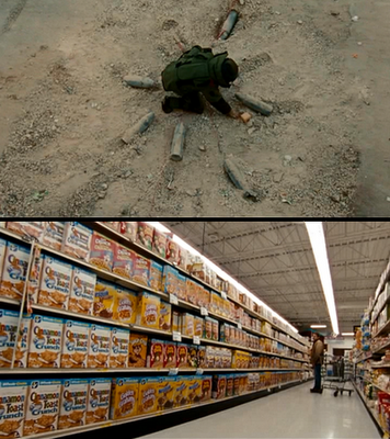 For most soldiers, the return home is a time of excitement – an opportunity to receive the reward that comes to a soldier for service to his country. For James, the opposite seems true. We see him alone in a grocery store, pushing a nearly empty shopping cart. His wife comes into the aisle with their son, her cart filled with food. She asks him to grab a box of cereal and meet her at the register. He agrees, but he seems lost, clearly out of his element. He is shown later, cleaning leaves from the gutter. Many soldiers talk about wanting to come home to help take care of the house. Again, he seems distracted – a bad thing on a ladder. I was struck with a strange thought: he was more likely to get hurt on an extension ladder in his front yard than in combat handling a bomb. They show a discussion in the kitchen between him and his wife. He’s telling her about a situation where dozens of people were killed. She listens but gives no reply, no acknowledgement of the strangely violent story he is relating. Instead, she asks him to chop some vegetables for dinner. Finally, we see him talking to his son – just a toddler. Here is where we would expect him to release his past, to embrace his future, and to begin the process of moving forward. That’s what you’d expect. This is what he said: