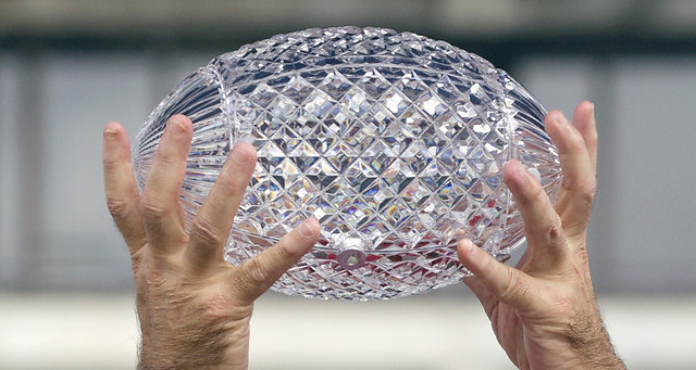 Alabama coach Nick Saban holds up the Coaches Trophy at Bryant Denny Stadium in Tuscaloosa, Ala., Saturday, Jan. 21, 2012. Alabama celebrated their 14th NCAA college football national championship with a 21-0 win over LSU in the BCS Championship game in New Orleans on Jan. 9. (AP Photo/Dave Martin)